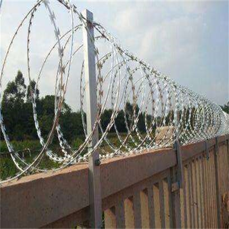 鋁包鋼刀片刺繩也叫生銹刀片刺繩是由鋁包鋼絲為原料生產的一種新興刀片刺繩,其產品較一般刀片刺繩來說質量輕、強度高、美觀、耐用。 主線采用250絲的純鋼絲,外面再包上50絲的鋁,這樣可以防止生銹。鋁的比重是鐵的三分之一左右,鋁包鋼刀片刺繩是純鋁絲制作的,刺繩的切口也不會因此而生銹的,這樣解決了刀片刺繩工序中的一大難題,雖說鋁的價格高高在上但是比重低,單位米數會長,合成本比普通熱鍍鋅差不多少的。以后大家需要在環境十分惡劣的情況下又有了一種新的選擇。