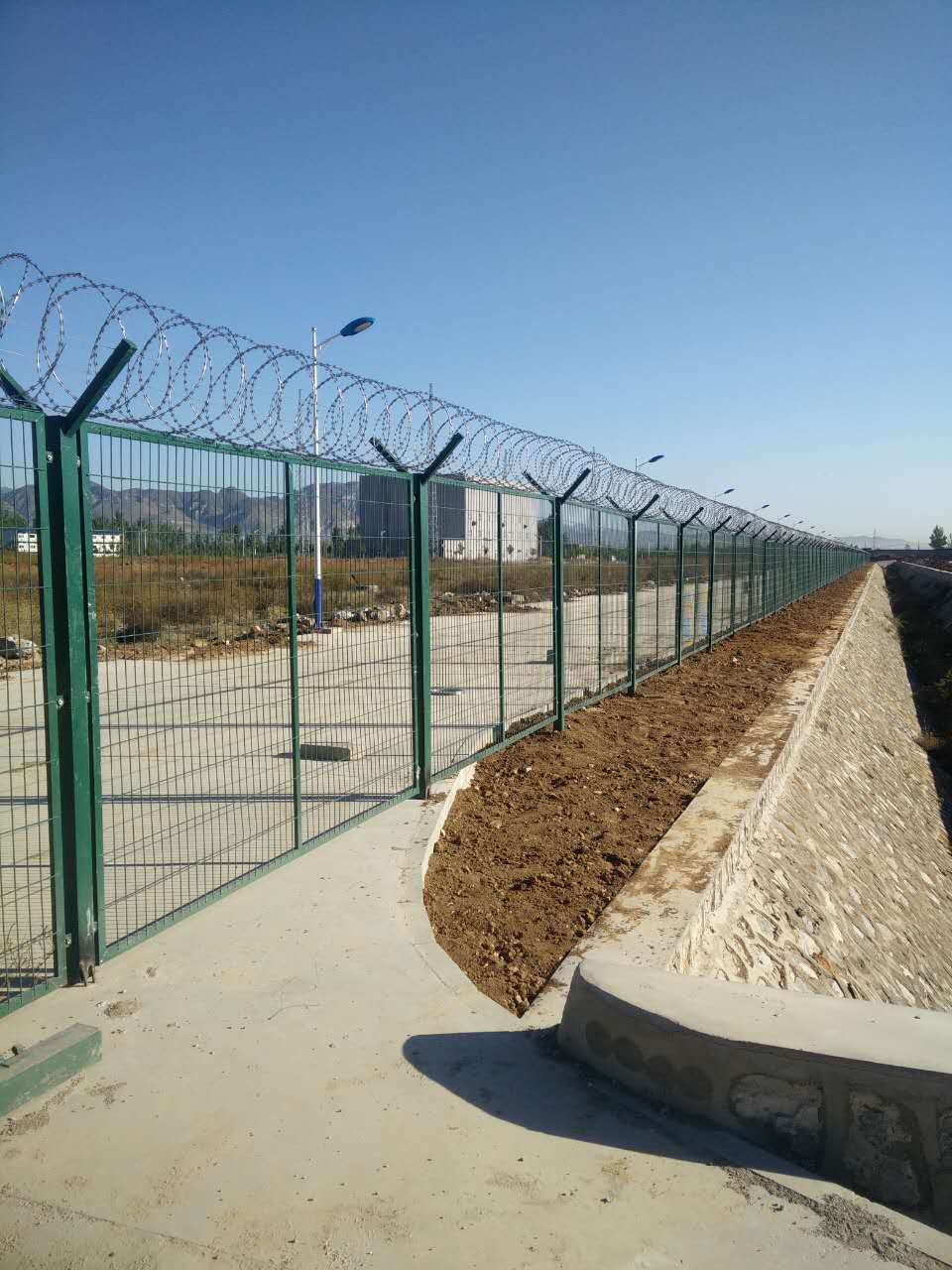 蛇腹型刀刺網與V型托網之間用適量固定卡子或用2-3條直徑3.0mm不銹鋼絲加固,鋼絲穿過V型托(預留孔)拉直固定。