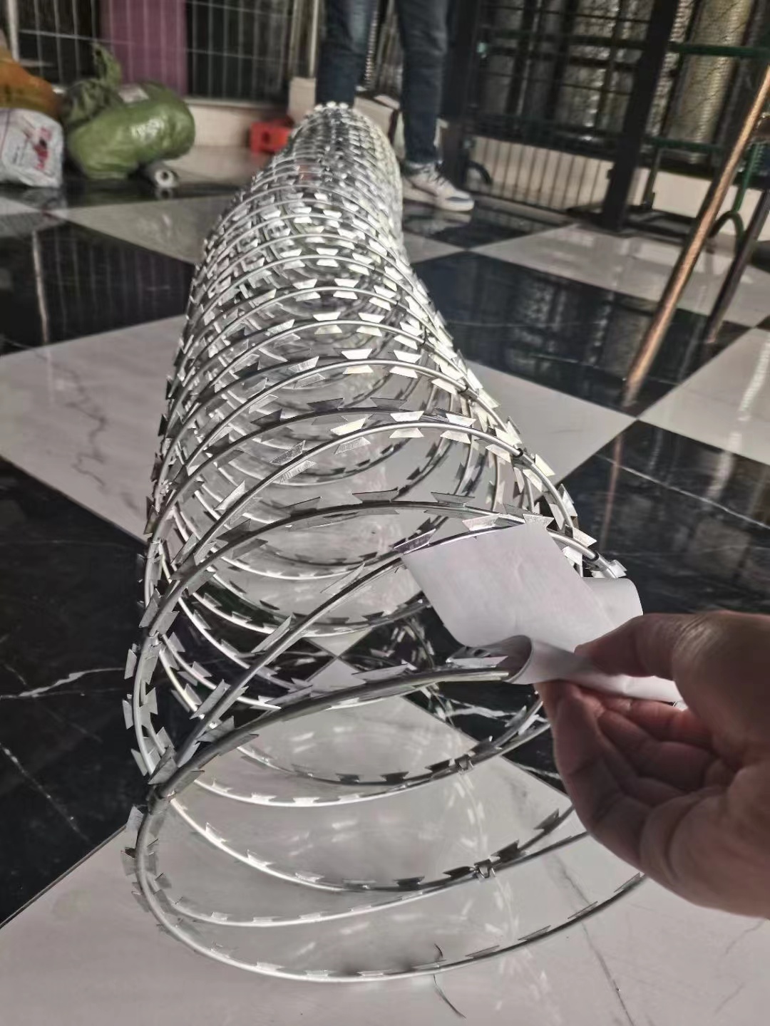 (2)測量各立柱基礎標高,保證安裝后蛇腹型刀刺網頂面的平順和美觀。階梯狀設置段,測出臺階的高度以確定立柱的高度。