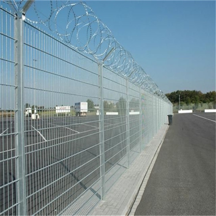 從結構組成來看,機場圍界網主要分為四部分:一是基礎結構,采用鋼筋混凝土澆筑地基,深度不低于0.8米,部分軟土地基需加深至1.2米,確保圍界抗風載、抗撞擊穩定性;二是網體主體,主流采用高強度鍍鋅鋼絲或不銹鋼絲焊接網片,網孔規格多為50mm×100mm或75mm×150mm,鋼絲直徑≥4mm,表面經浸塑或噴塑處理(顏色以草綠、深灰為主),兼具防腐蝕與隱蔽性;三是頂部防越設施,飛行區、油庫等重點區域圍界頂部,需加裝0.5-0.8米高的刀片刺網,刀片刺網采用交叉螺旋式安裝。四是輔助結構,圍界每隔3-5米設置混凝土或鋼管立柱,立柱與網體通過防盜螺栓連接,部分區域還會在圍界底部加裝防鉆鋼板,防止人員從底部挖洞入侵。