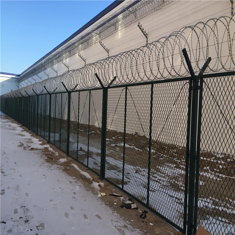 刺絲滾籠隔離網(wǎng)網(wǎng)片:寬2500mm、 高200mm,分上下二層結(jié)構(gòu),總高4米;上下層之間邊耳連接,根據(jù)需要做加強(qiáng)折彎,確 保網(wǎng)片不變形。