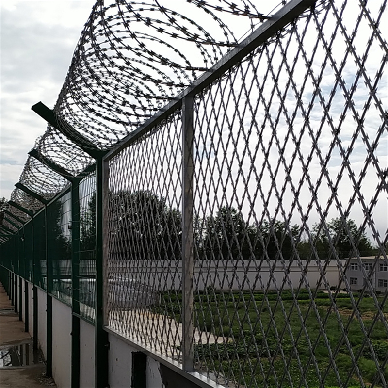 巡邏道防爬隔離網(wǎng)整體設(shè)計高大、美觀、實用,網(wǎng)墻的設(shè)計具剪切、防攀爬功能,能夠十分有效的防止罪犯的潛逃。監(jiān)獄巡邏道鋼網(wǎng)墻V型架頂端安裝刀片刺網(wǎng),直徑采用50cm-60cm刀片刺網(wǎng)主要是由熱鍍鋅鋼板或不銹鋼薄板沖壓而成的,它擁有尖銳的刀片,高張力鍍鋅鋼絲或者不銹鋼絲做芯線組合而成的產(chǎn)品。