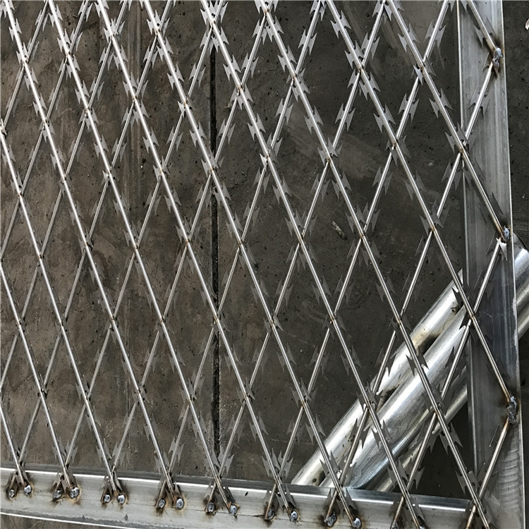 監獄焊接刀片刺網網片:寬2500mm、高2000mm;分上下兩層結構,總高4米;上下層之間邊耳連接,確保網片不變形。