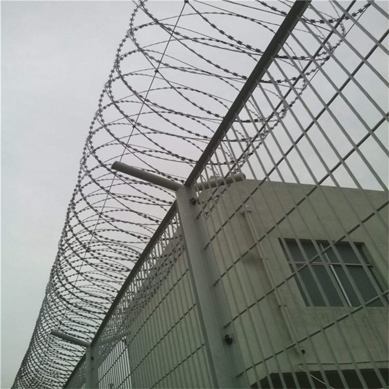勞教所隔離護欄-看守所隔離護欄是用在勞教所、看守所的護欄,也可以用在監獄、機場等場所。起安全隔離防護的作用,其結構是由一般采用2米高的網片+2.5米高的Y字型立柱+φ500mm或φ600mmr的刀刺網,整體下來可達2.5米左右。因其高度對犯罪分子起到無法攀爬的作用,起到很好的防護效果。