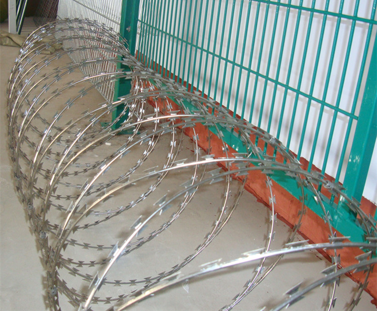 監獄鋼網墻刺刀圈常用的規格是BT0-22型,刀片厚度:05±0.005、芯線直徑:2.5±0.1、刀長度:22±1刀寬度15±1刀間距:34±1。