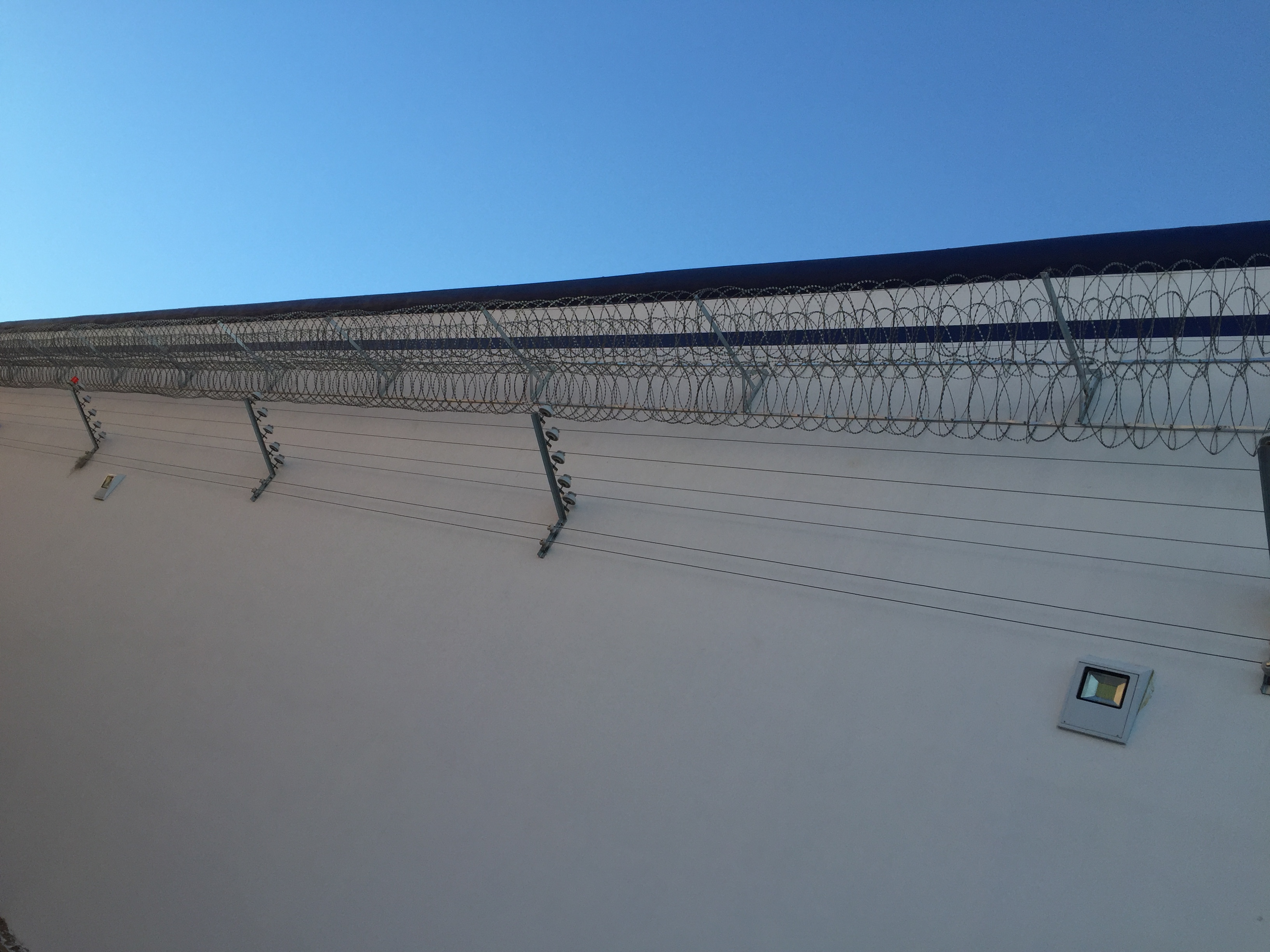 監(jiān)獄鋼網(wǎng)墻、看守所隔離網(wǎng)、機(jī)場圍界網(wǎng)等,大多在頂部用V型支架加裝蛇腹形刺刀圈,這種刺刀圈呈螺旋狀,一般多為不銹鋼材質(zhì),結(jié)構(gòu)新穎、堅(jiān)固緊密、網(wǎng)面平整、網(wǎng)孔均勻、刀鋒銳利、防攀爬、抗腐蝕性強(qiáng)。