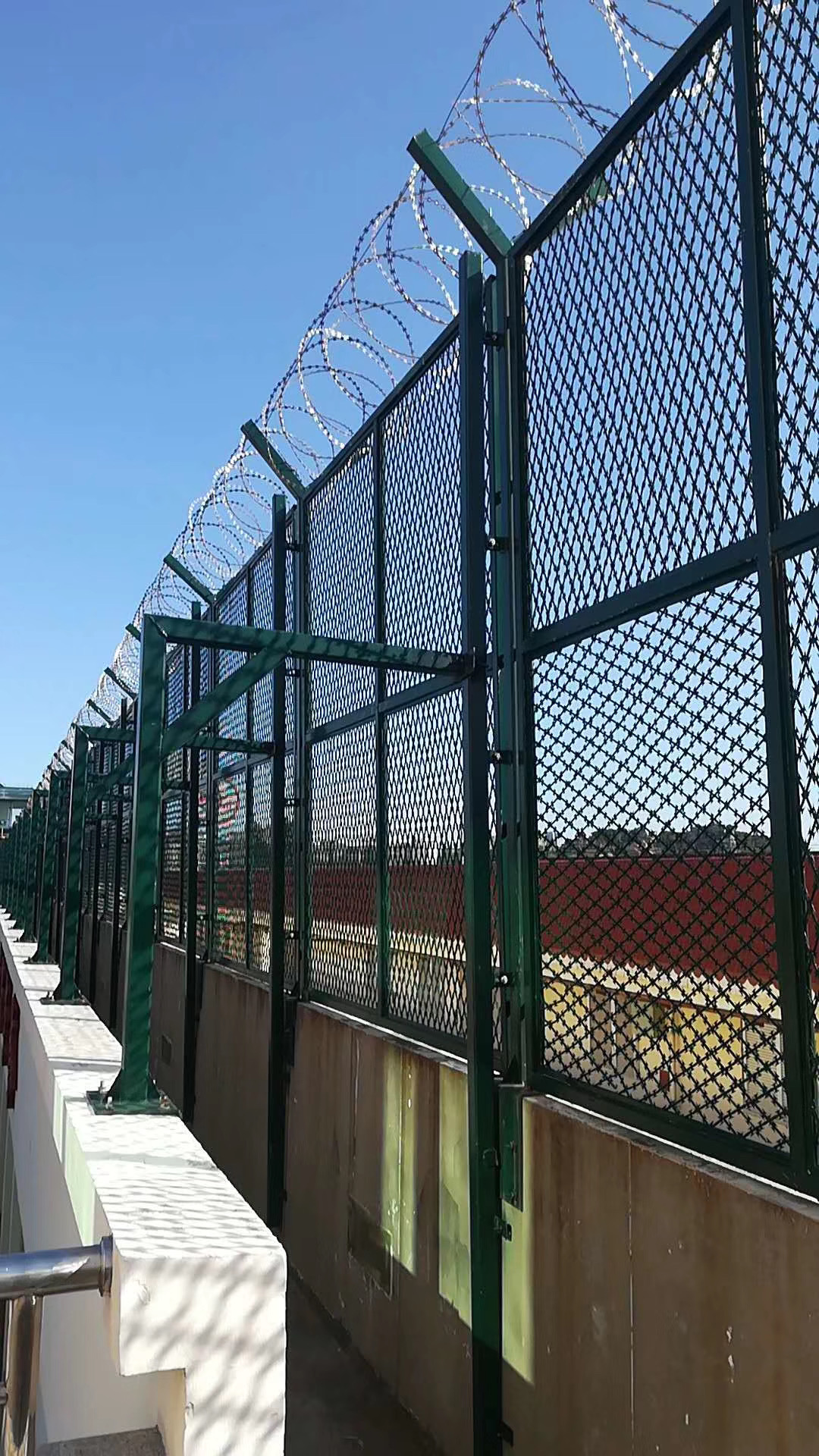 熱鍍鋅金屬監(jiān)獄鋼網(wǎng)墻主要是選用高強度的刀片刺網(wǎng)與普通防護網(wǎng)的結(jié)合,由V型支架立拄,加強型焊接片網(wǎng),安全防盜銜接件和刀片刺網(wǎng)組成.一種新型防護網(wǎng),由銳利尖角鍍鋅鋼板或不銹鋼薄板做刀片,鋼絲做芯線組合而成的防護器件. 監(jiān)獄鋼網(wǎng)墻刀片刺網(wǎng)具有嚇阻、防翻越等作用,原料堅固,高強度,高張力,造型設計共同,不宜觸摸,因而能到達極好的防護阻隔作用。