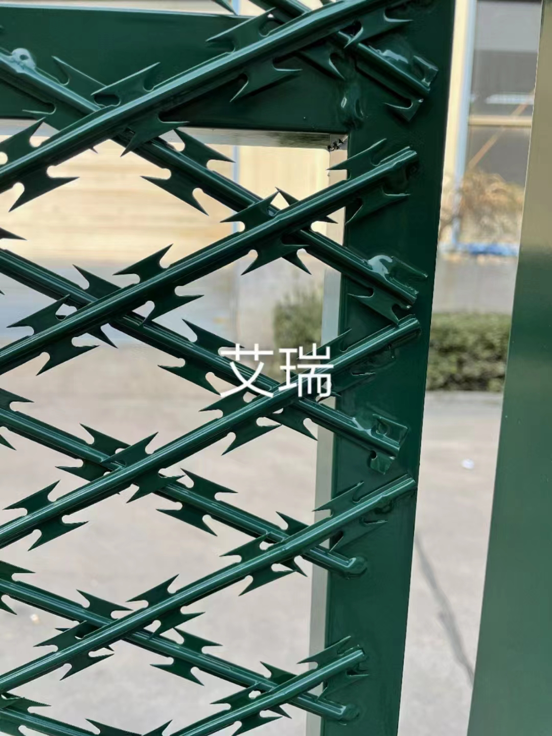 8.雙螺旋蛇腹形刀刺網:304不銹鋼材質,圈徑600mm,每米7個扣;刀片BTO-22,芯線直徑2.5mm,刀片厚0.5mm,刀片長22mm,刀片寬15mm,刀片間距35mm.鋼絲拉線捆扎線:304不銹鋼材質,直徑4.0mm,2道分列Y型支臂兩側,形成V型支撐區